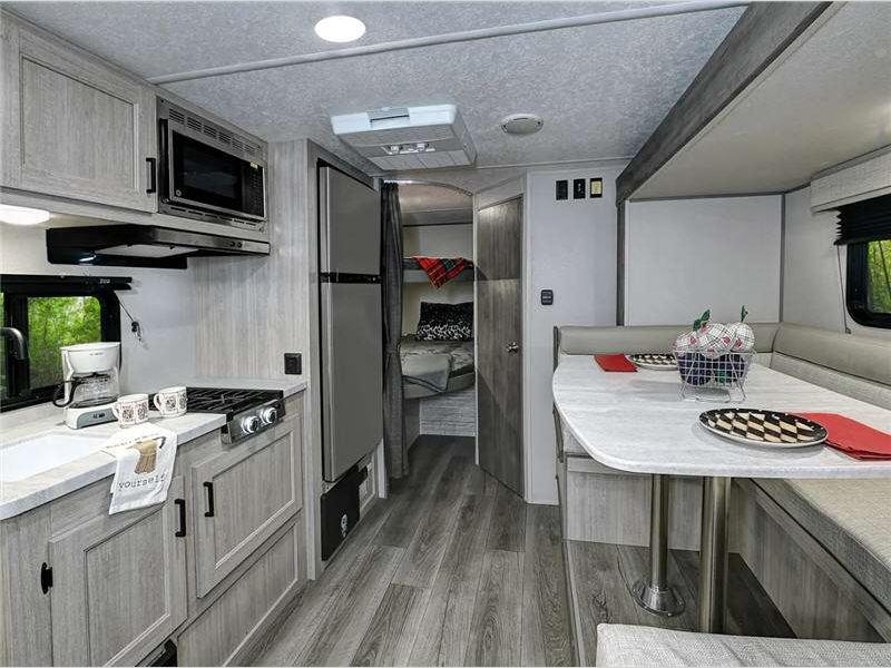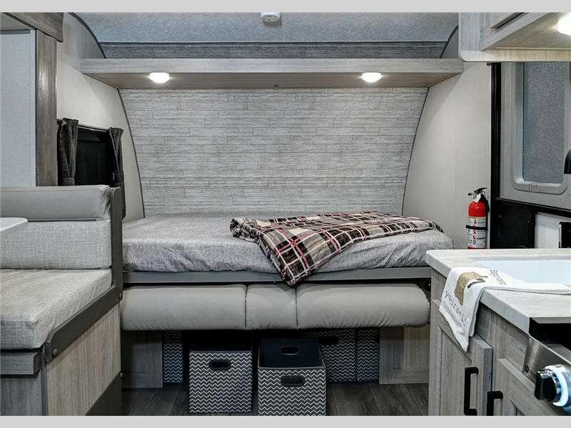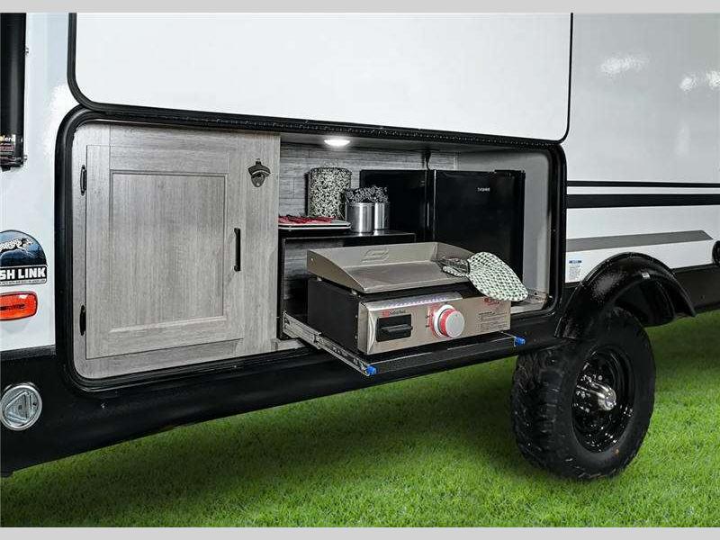 Each is built with an Off Grid Solar system, a spare tire, a flip-down cargo rack with 200 lbs. capacity, oversized off-road fender flares and all-terrain tires. Also included is a 3" lift kit, built-in roof backers with kayak rack prep, a heavy duty standard tongue jack, and a diamond plate rock guard for protection while traveling on the highway or off-grid. The interior provides seamless Thermofoil countertops throughout, and the kitchen offers a deep basin farm style sink with high rise bullet style faucet, plus USB ports and outlets to keep everything charged. There are many more features that offer comfort and convenience.