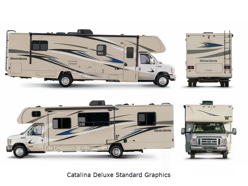 Sleeps 8 Slides 1 Length 32 ft 9 in Ext Width 8 ft 6 in Ext Height 11 ft Int Height 6 ft 10 in Interior Color Lennon with Charcoal, Lennon with Medium Gray, Starr Exterior Color Standard Graphics; Catalina Deluxe, Chestnut Deluxe. Full-Body Paint; Cool Mist, Suede Hitch Weight 7500 lbs GVWR 14500 lbs Fresh Water Capacity 44 gals Grey Water Capacity 30 gals Black Water Capacity 30 gals Furnace BTU 30000 btu Generator 4,000W Gas Fuel Type Gasoline Engine 7.3L V8 Premium Chassis Ford E450 Horsepower 350 hp Fuel Capacity 55 gals Wheelbase 220 in Number Of Bunks 1 Available Beds Queen Refrigerator Type Two Way Large Double Door with Freezer Refrigerator Size 8 cu ft Cooktop Burners 3 Shower Size 26" x 30" Number of Awnings 1 Axle Weight Front 5000 lbs Axle Weight Rear 9600 lbs LP Tank Capacity 76.14 lbs Water Heater Capacity 6 gal Water Heater Type LP with Electronic Ignition AC BTU 15000 btu Basement Storage 108.3 cu. ft. TV Info LR 32" HDTV, BR 24" HDTV Awning Info 20' Power with LED Lighting Gross Combined Weight 22000 lbs Shower Type Standard Electrical Service 30 amp Similar Floorplans