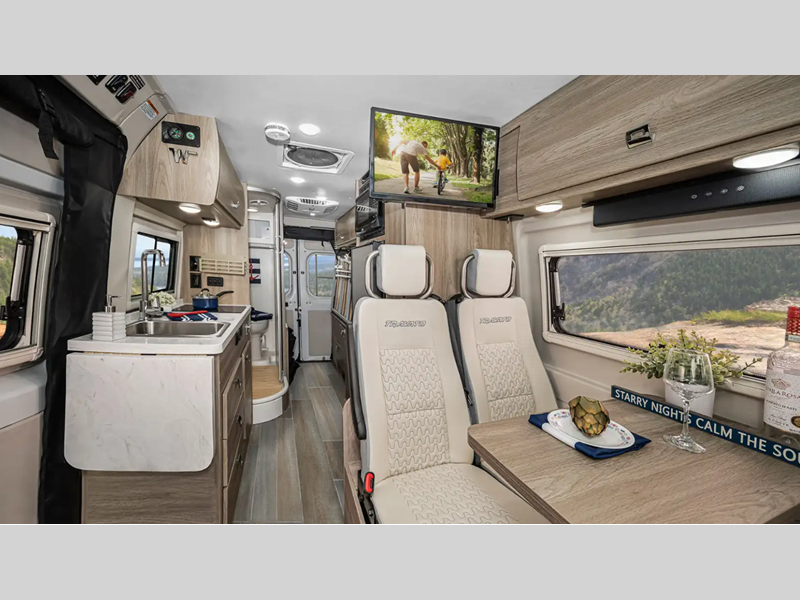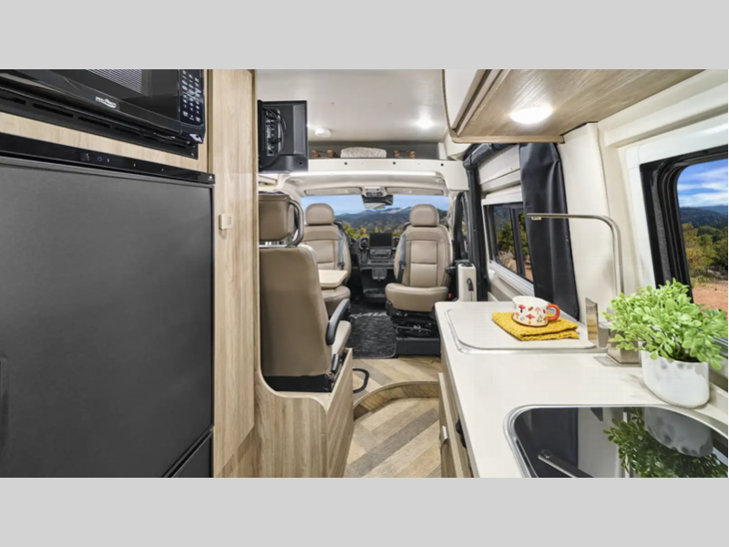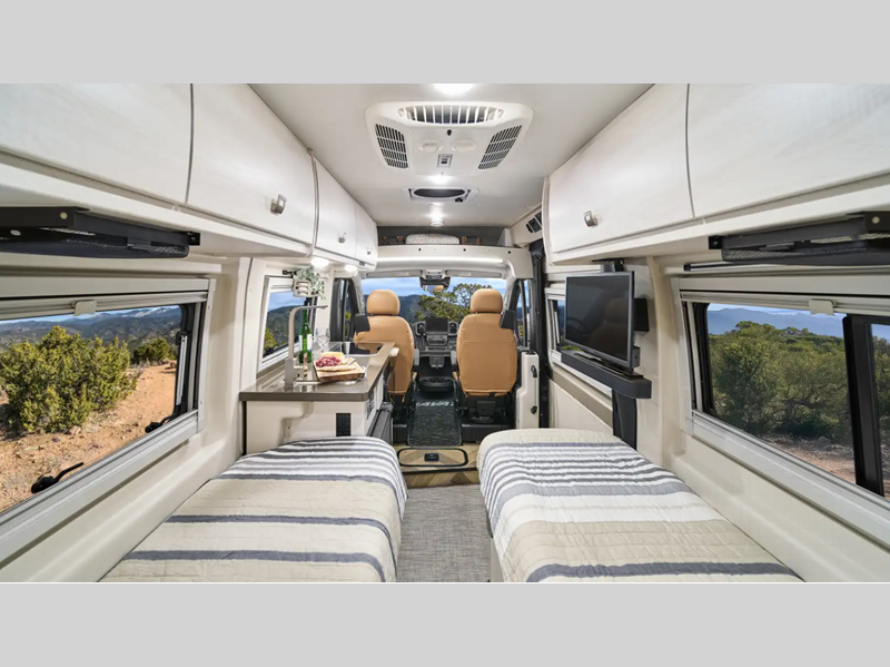 Sleeps 2 Length 21 ft Ext Width 6 ft 9 in Ext Height 9 ft 4 in Int Height 6 ft 3 in Interior Color Canyon with Soft Oak, Cashmere with Weathered Teak II Exterior Color Full Body Paint, Deluxe Full Body Paint Choices; Bright White, Bright Silver, Ceramic Gray, Sandstone Hitch Weight 3500 lbs GVWR 9350 lbs Fresh Water Capacity 18 gals Grey Water Capacity 13 gals Black Water Capacity 12 gals Generator 2,800W Gas Fuel Type Gasoline Engine 3.6L V6 Chassis Ram ProMaster Horsepower 280 hp Fuel Capacity 24 gals Wheelbase 159 in Available Beds Two Twin Refrigerator Type Single Door Compressor Driven Refrigerator/Freezer 12V Refrigerator Size 4.3 cu ft Convection Cooking Yes Cooktop Burners 2 Shower Size 25" x 43" Number of Awnings 1 Axle Weight Front 4629 lbs Axle Weight Rear 5291 lbs LP Tank Capacity 25 lbs Water Heater Capacity 2.6 gal Water Heater Type Truma Combi G Comfort Plus TV Info Coach 24" HDTV Awning Info 13' Rack Mounted Power with LED Lighting and Bluetooth Control Gross Combined Weight 12000 lbs Shower Type Wet/Bath Shower Electrical Service 30 amp Similar Floorplans
