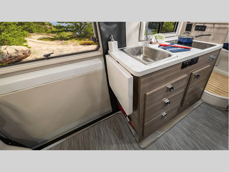 You can keep traveling even when the elements are less than forgiving with features like the Truma Combi G heating system that uses propane and/or electricity to provide hot water and coach heat. Innovative features like multiple storage for smaller accessories, LED ceiling lights , and a luggage rack makes life on the road easier than ever!